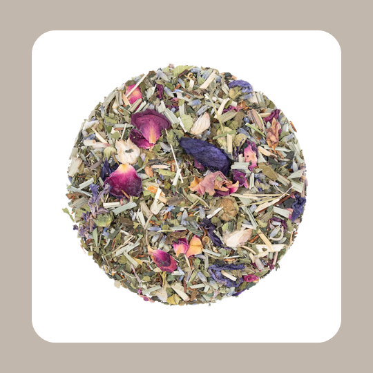 Rooibos, spearmint, lemongrass, nettle, lavender, passionflower, lemon verbena, rose petals, willow bark, plum petals, mallow petals