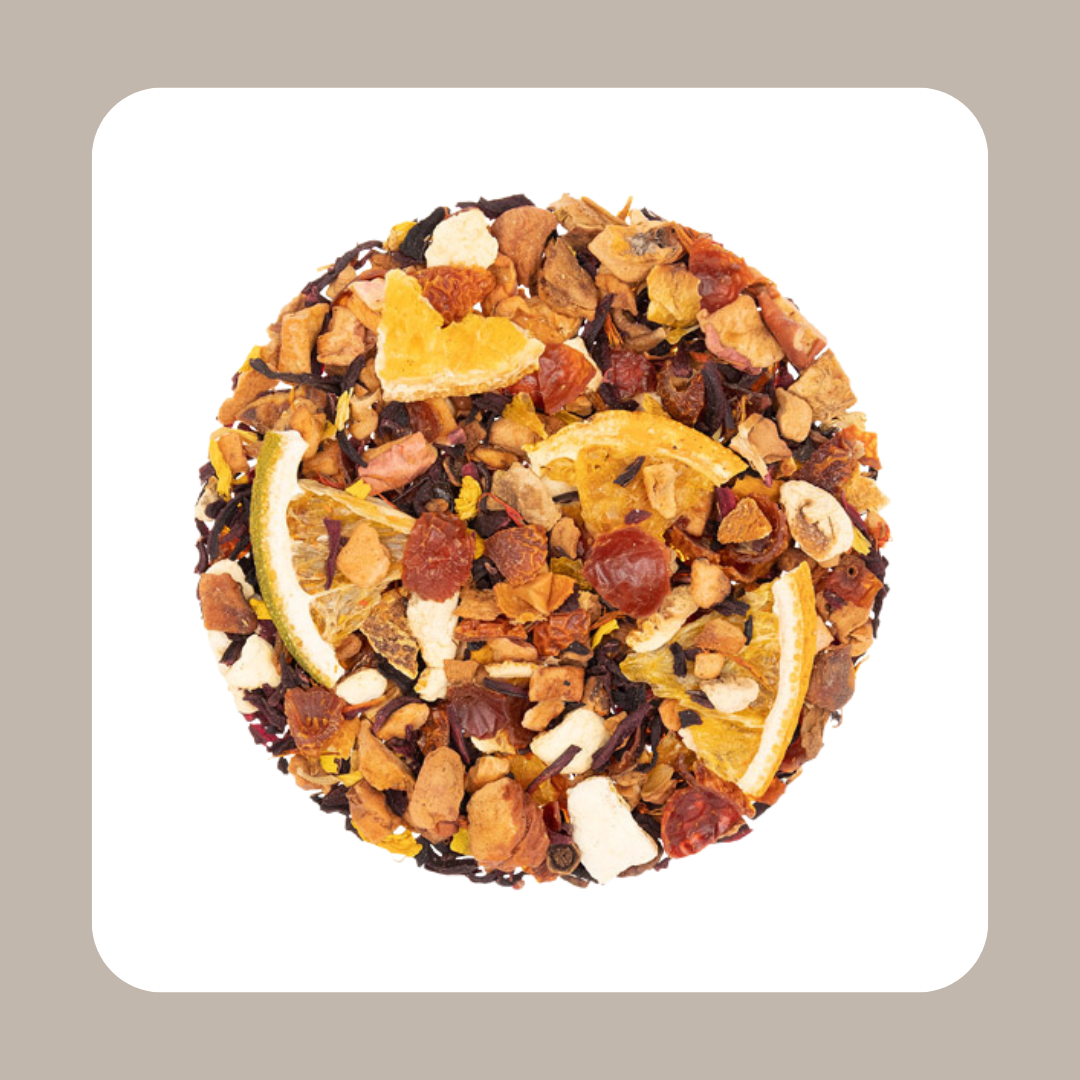 Apple, hibiscus, rosehip, orange pieces, safflower petals, marigold petals, calendula petals, natural flavors (organic compliant)